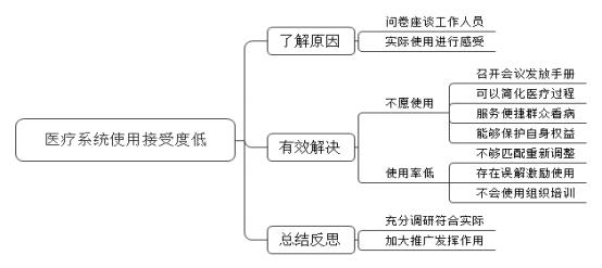 第一, 做好充分了解。一方面, 通過問卷以及座談會,向基層醫(yī)療單位的工作人員詢問不愿意接受和使用醫(yī)療系統(tǒng)的原因。另一方面, 實際操作醫(yī)療系統(tǒng), 檢驗醫(yī)療系統(tǒng)在實際工作中的使用情況,做到心中有數(shù)。