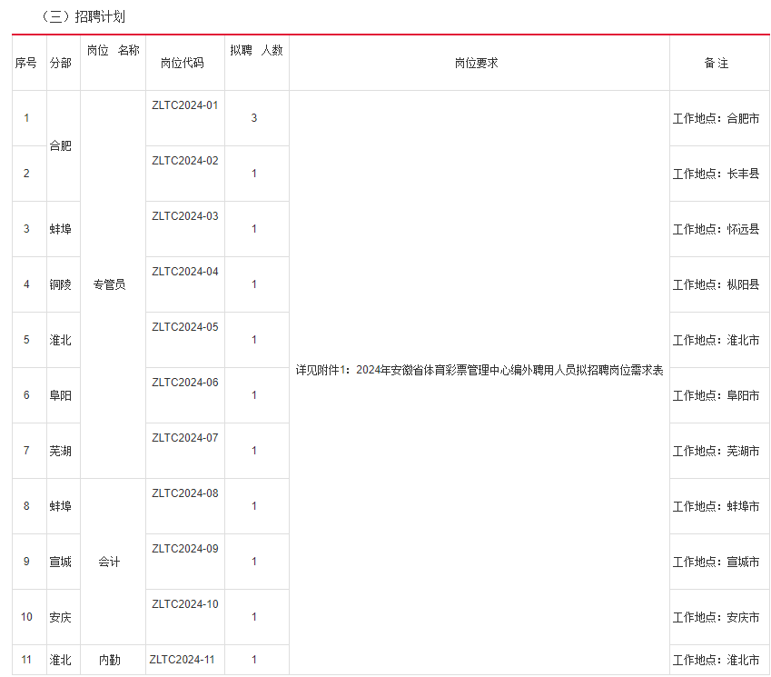 根據工作需要,經研究同意,現由合肥智聯人力資源服務有限公司(以下簡稱智聯人力)為安徽省體育彩票管理中心(以下簡稱省體彩)公開招聘13名工作人員。有關事項公告如下: